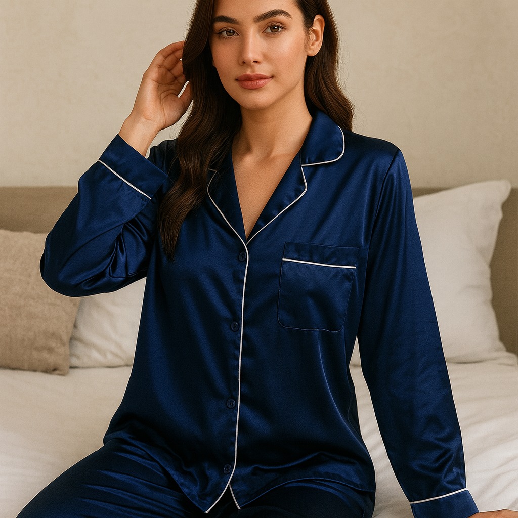 Premium Satin Silk Pajama Set for Women – Elegant Navy Blue Nightwear
